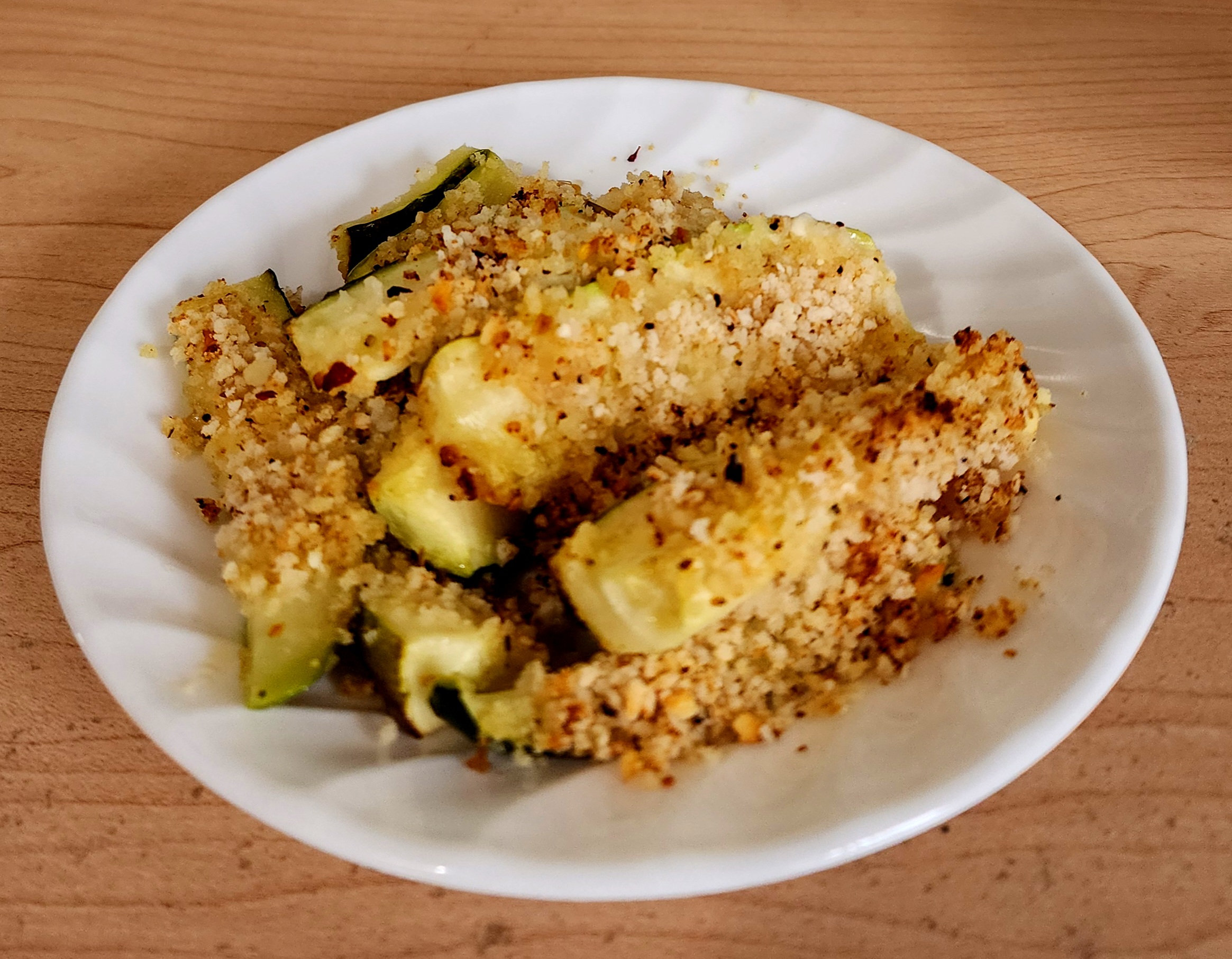 Zucchini is packed with nutrients like vitamin C, A, B (B1, B2, B6), minerals (potassium, magnesium, folate, copper, zinc), omega 3s, protein and anti-oxidants. This is a very easy, nutritious and yummy recipe. Sliced Zucchini are tossed in olive oil, coated with bread crumbs and spices and then baked in the oven. You can use any spices you want.