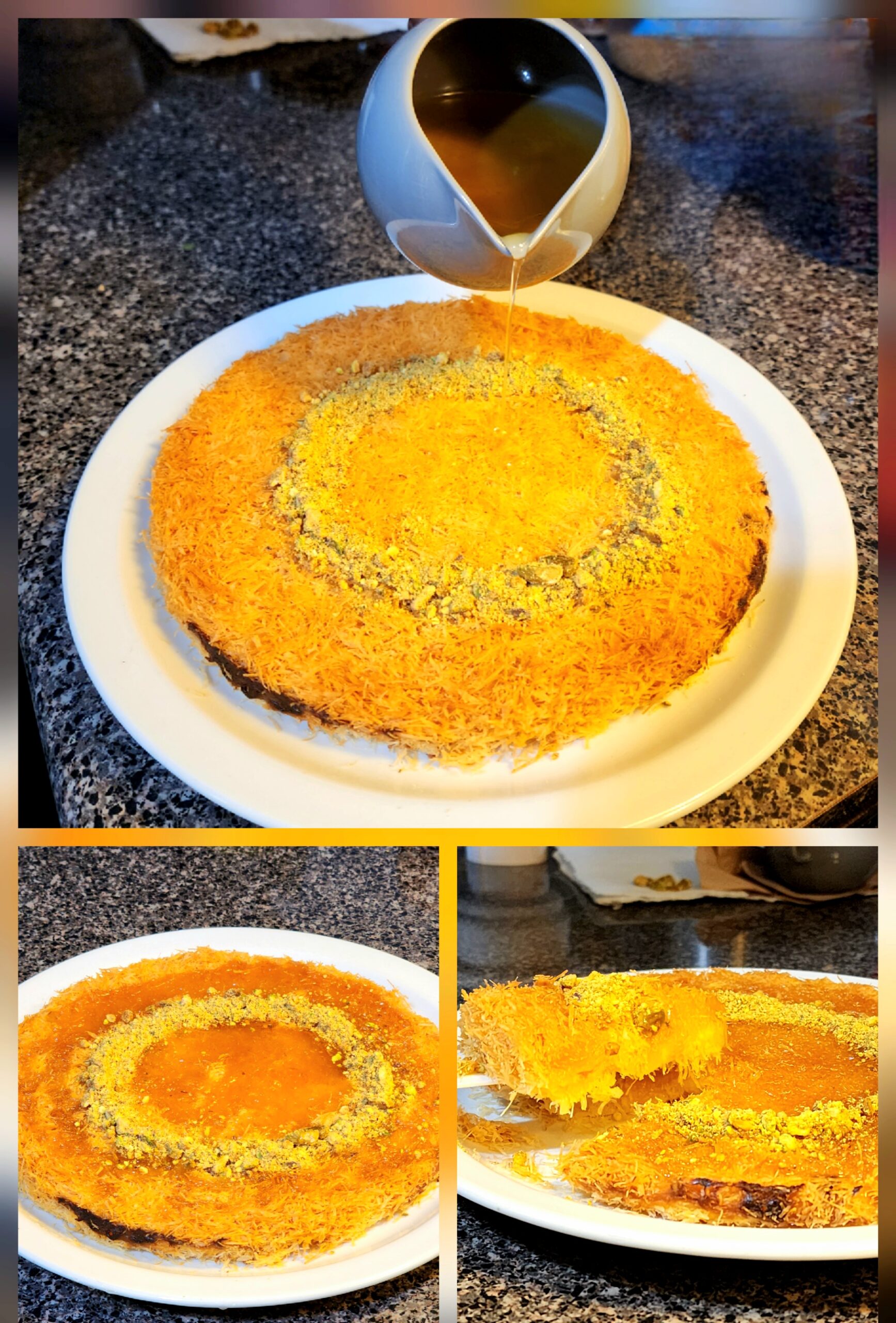 - Pour sugar syrup over kunafa