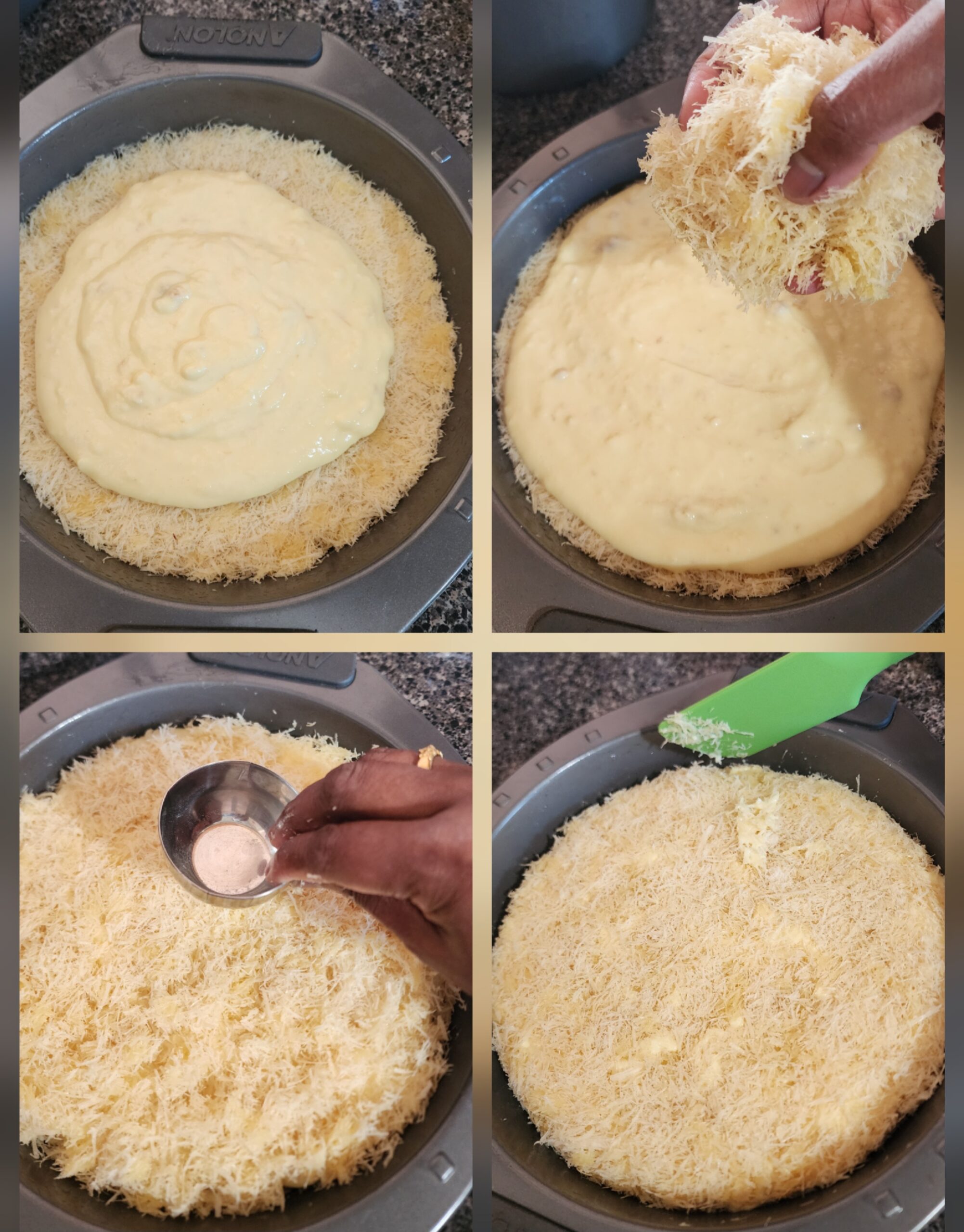 - Spread half of crushed pheni in the baking pan