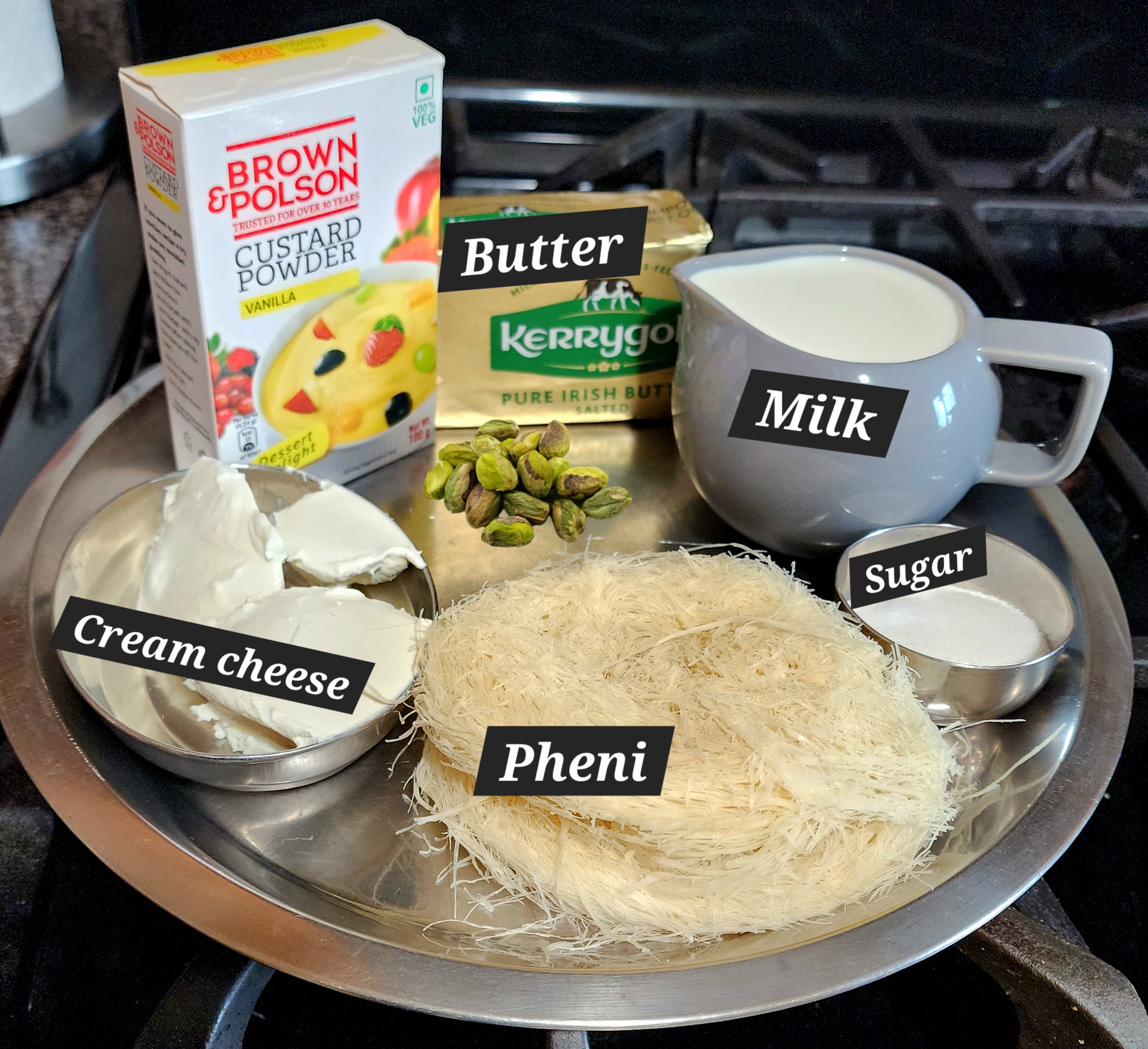Kunafa (Knafeh) is one of the most famous Middle Eastern deserts. It is a crunchy, buttery dessert made with shredded pastry (or vermicelli or pheni) layers, filled with a creamy soft milk pudding, soaked in sugar syrup and garnished with crushed pistachios. Traditionally, vermicelli is used to make kunafa. Here, I used pheni in place of vermicelli. Pheni is a pre-fried, crispy Indian vermicelli made from flour and ghee.