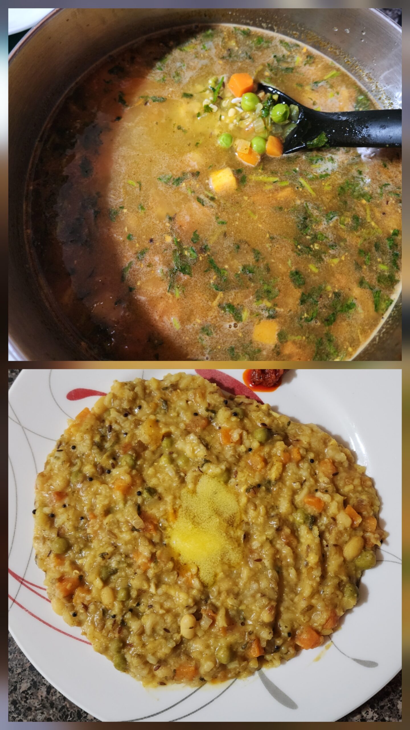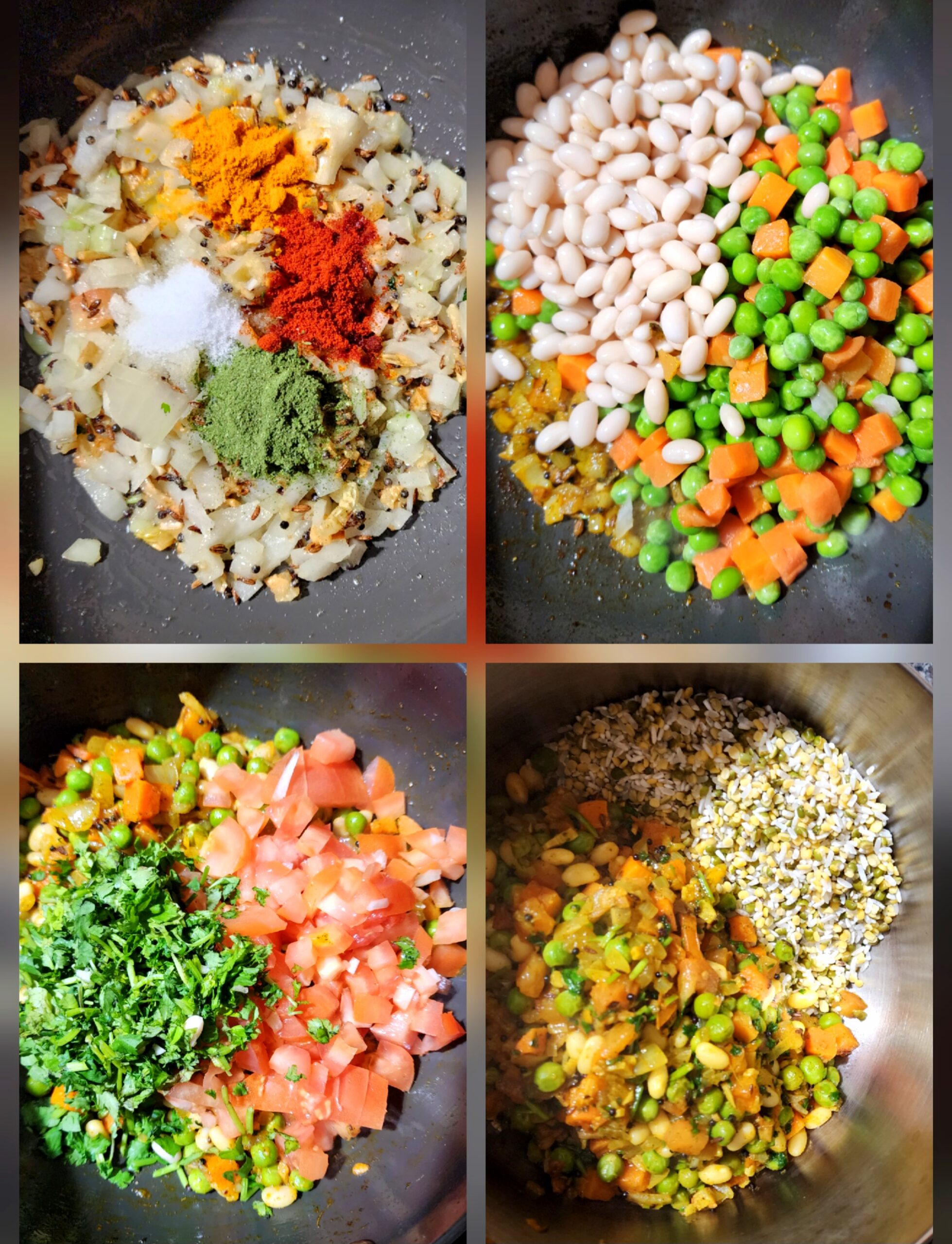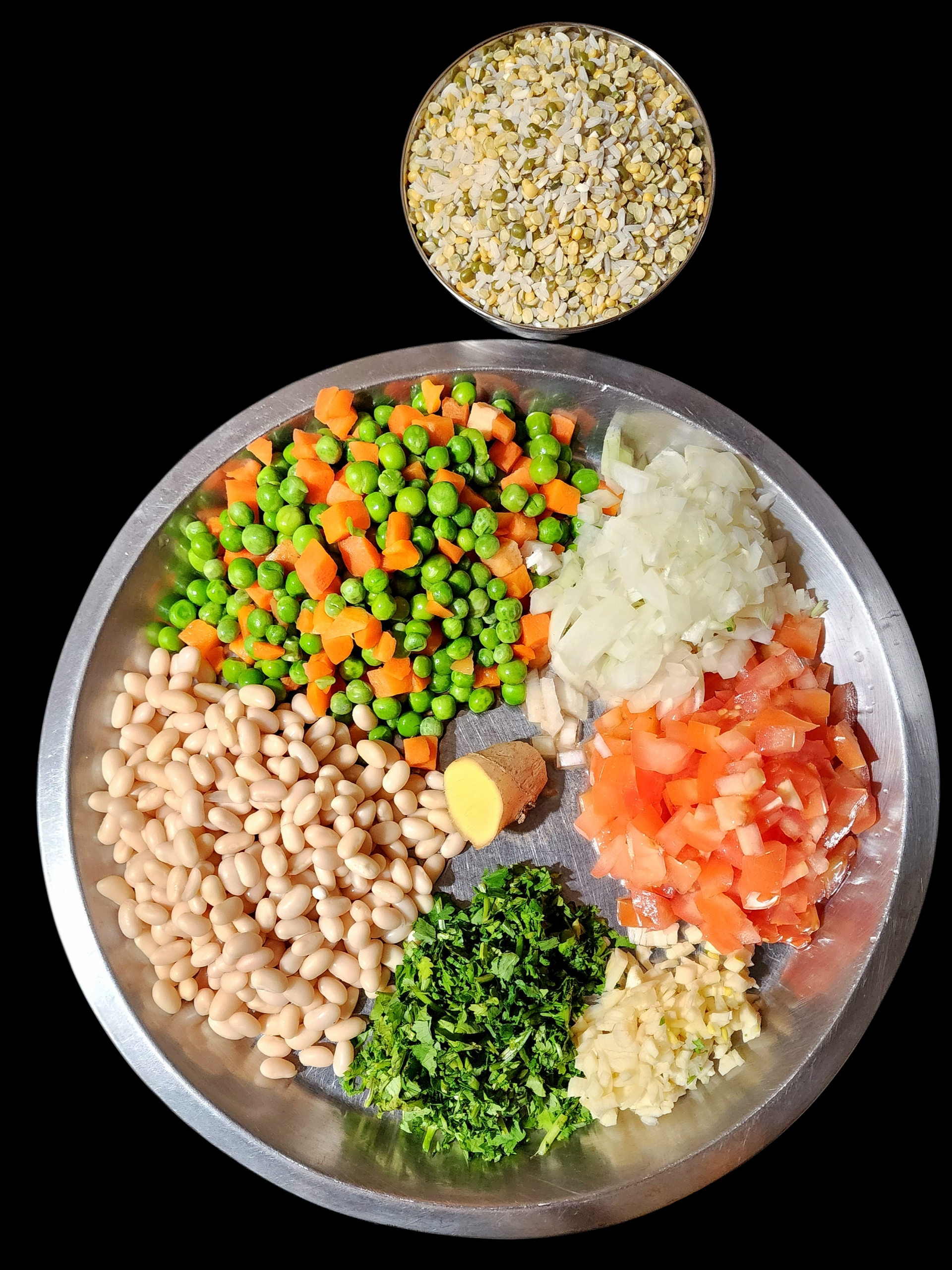 Khichdi is an Indian staple food that is a blend of cooked lentils and rice seasoned with mild spices. Masala Khichdi is a one-pot nutritious meal made with rice, moong dal, beans, veggies and mild spices. You can use sprouted beans to make it more nutritious.