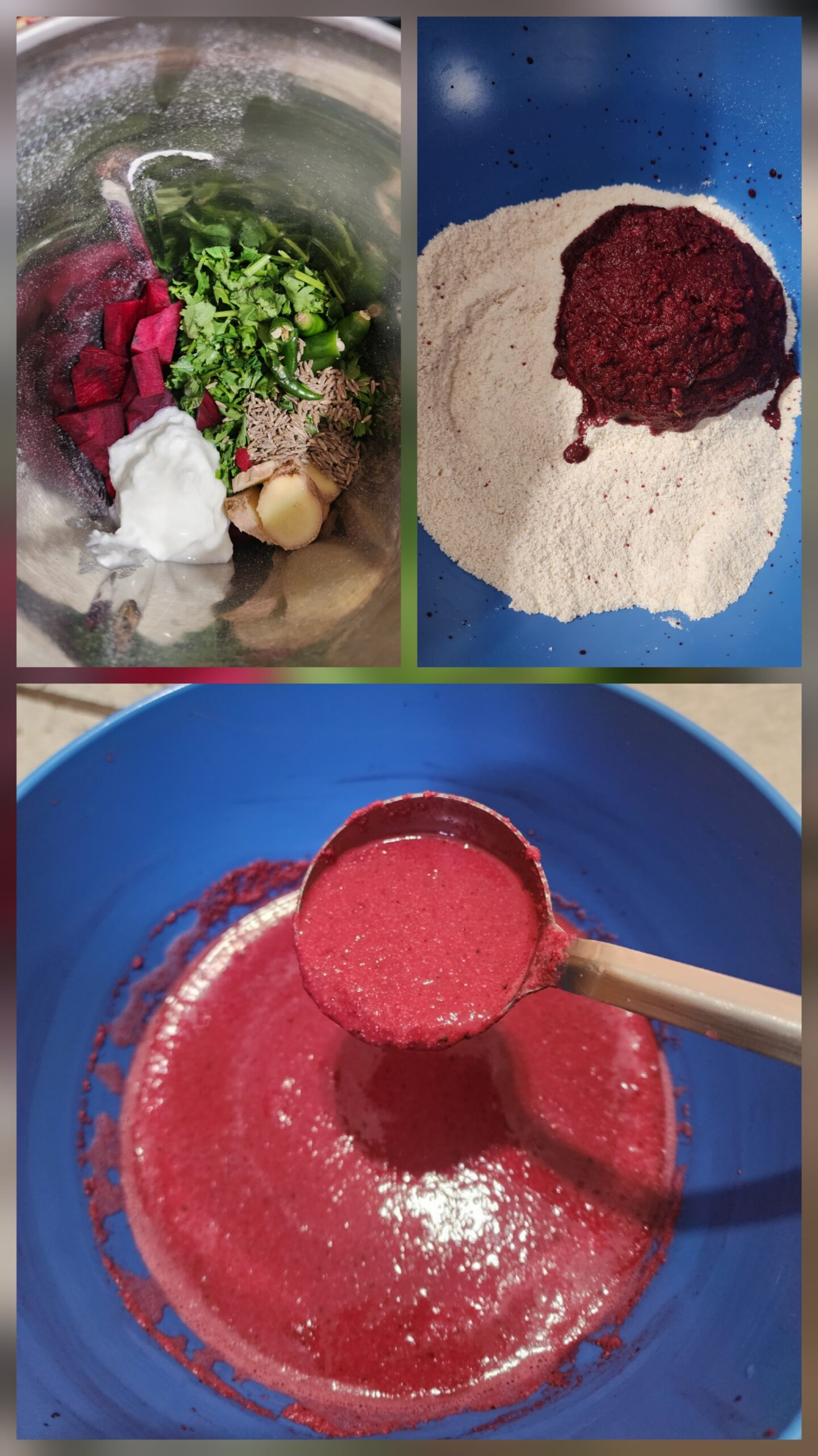 • Grind beetroot pieces, ginger, green chili, cumin seeds, salt, cilantro and curd to a thin paste